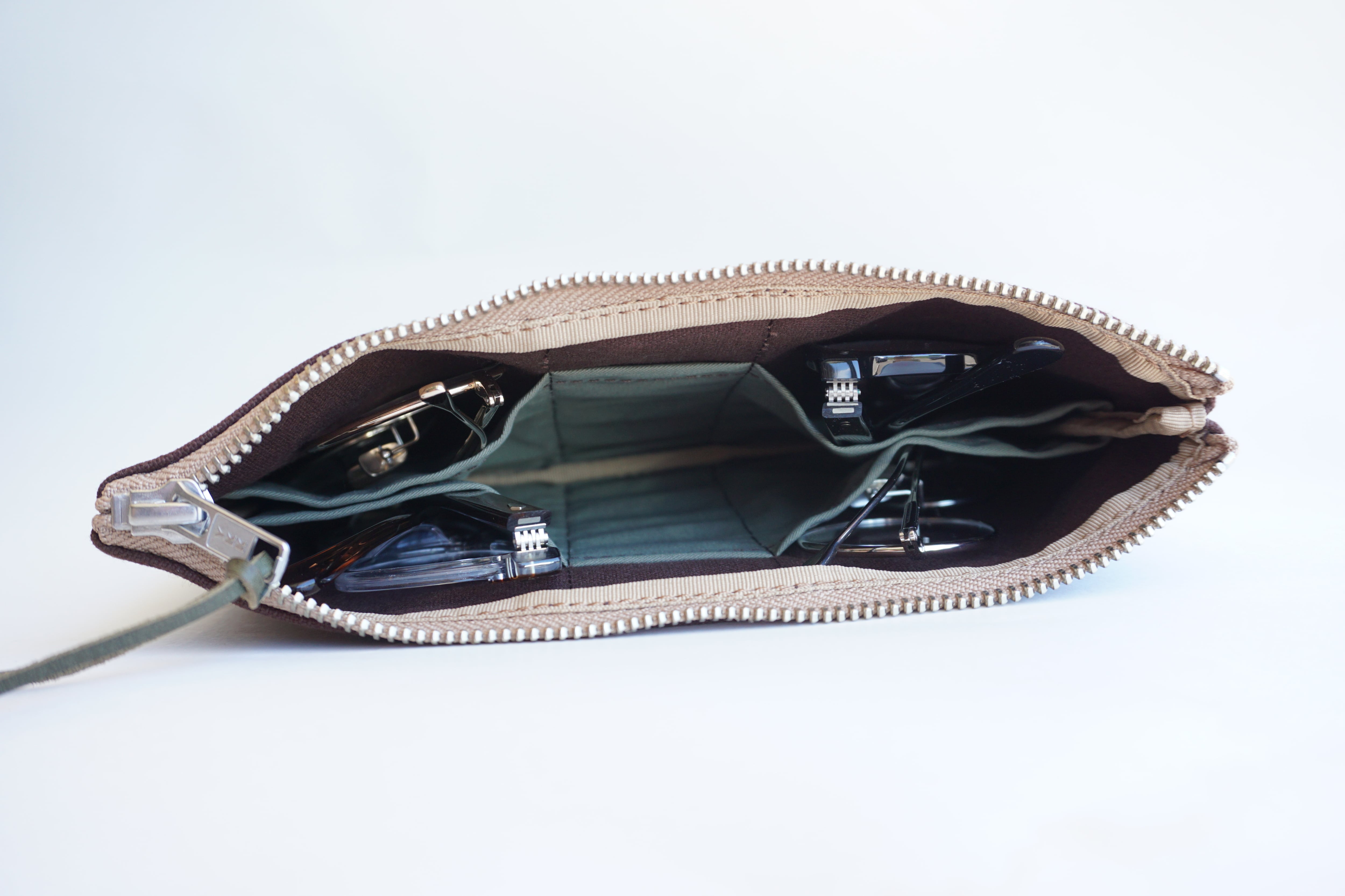 商品のコンセプトは、複数の眼鏡やサングラスをいれて持ち歩けるクラッチバックのようなポーチです。