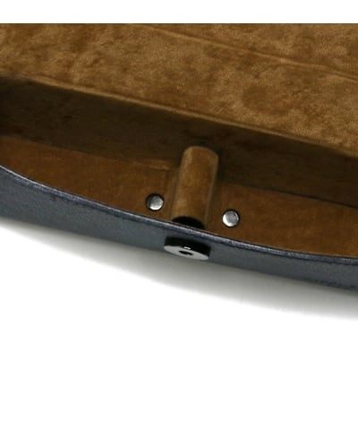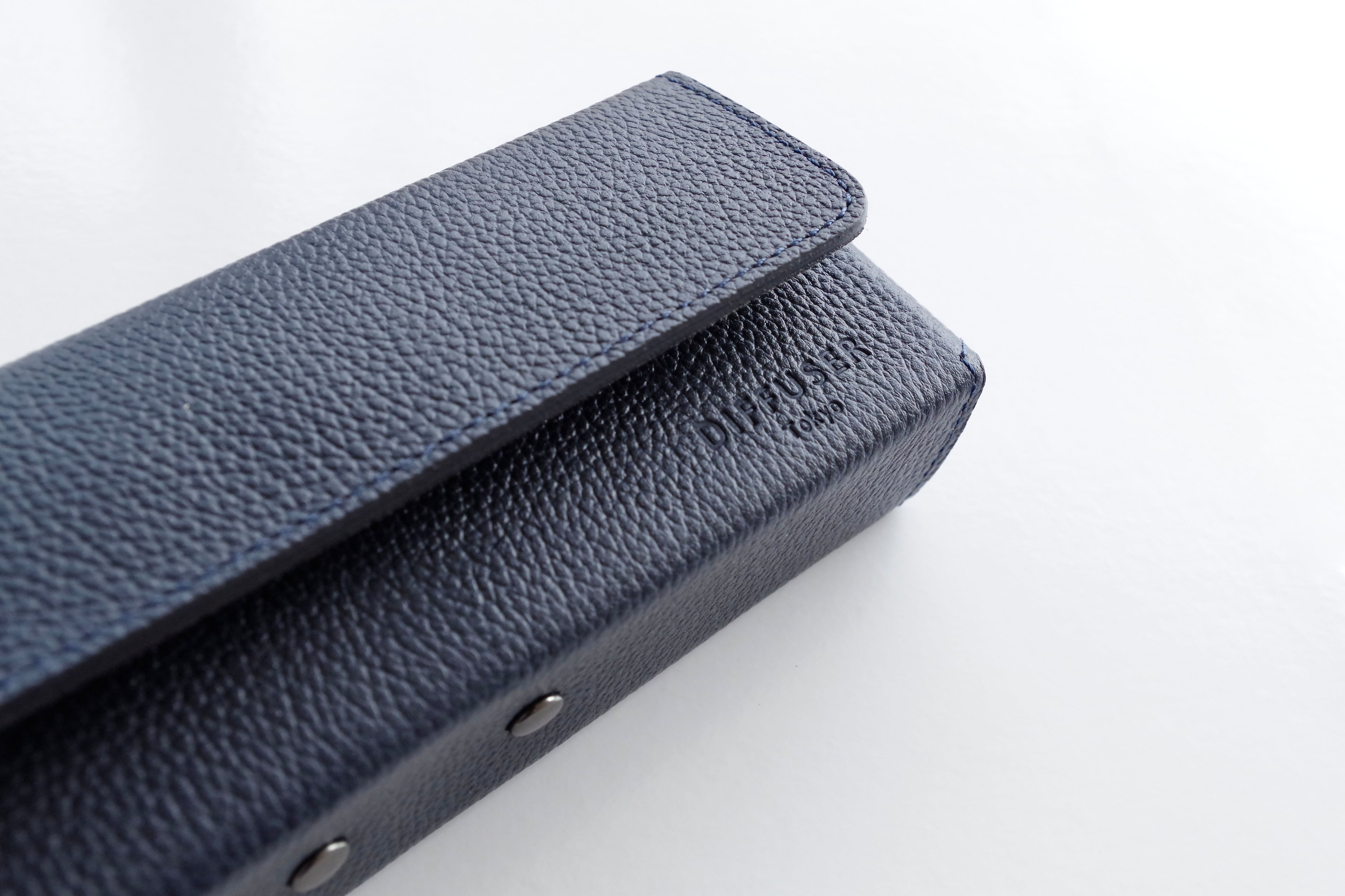 人気の高いボックス型のアイウエアケースを日本のシュリンクレザーで制作しました。側面の革の重ね合わせを固定したカシメピンは、デザインのポイントとして際立っています。マグネットホックで開閉しやすい蓋の構造。